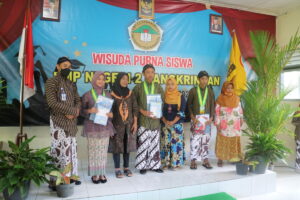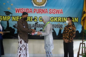 Acara selanjutnya adalah proses wisuda dengan penyerahan samir dan kelulusan yang didampingi wali kelas masing-masing, yaitu wali kelas 9A Ibu Sri Sunariningsih, S.Pd, wali kelas 9B Ibu Dalinem, S.Pd., Wali Kelas 9C Ibu Heni Tristianti, S.Pd.I. Setelah siswa-siswa maju mendapatkan samir, selanjutnya bagi siswa-siswa dengan perolehan nilai tertinggi didampingi oleh Kepala Sekolah Bapak Wijokongko, S.Pd., yaitu siswa dengan perolehan nilai ASPD tertinggi: